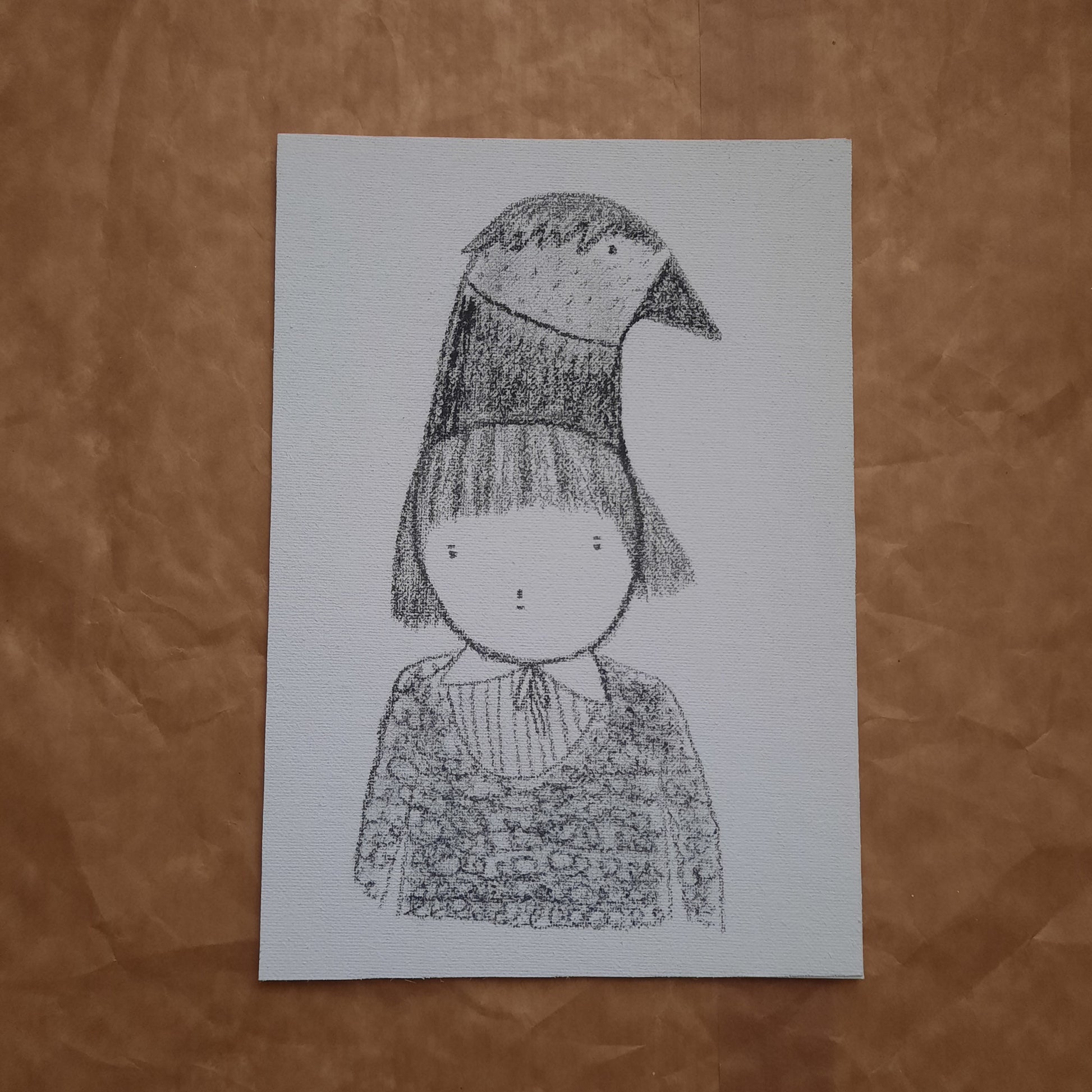 Pencil and charcoal drawn on shirt collar fabric (glued) on board.
