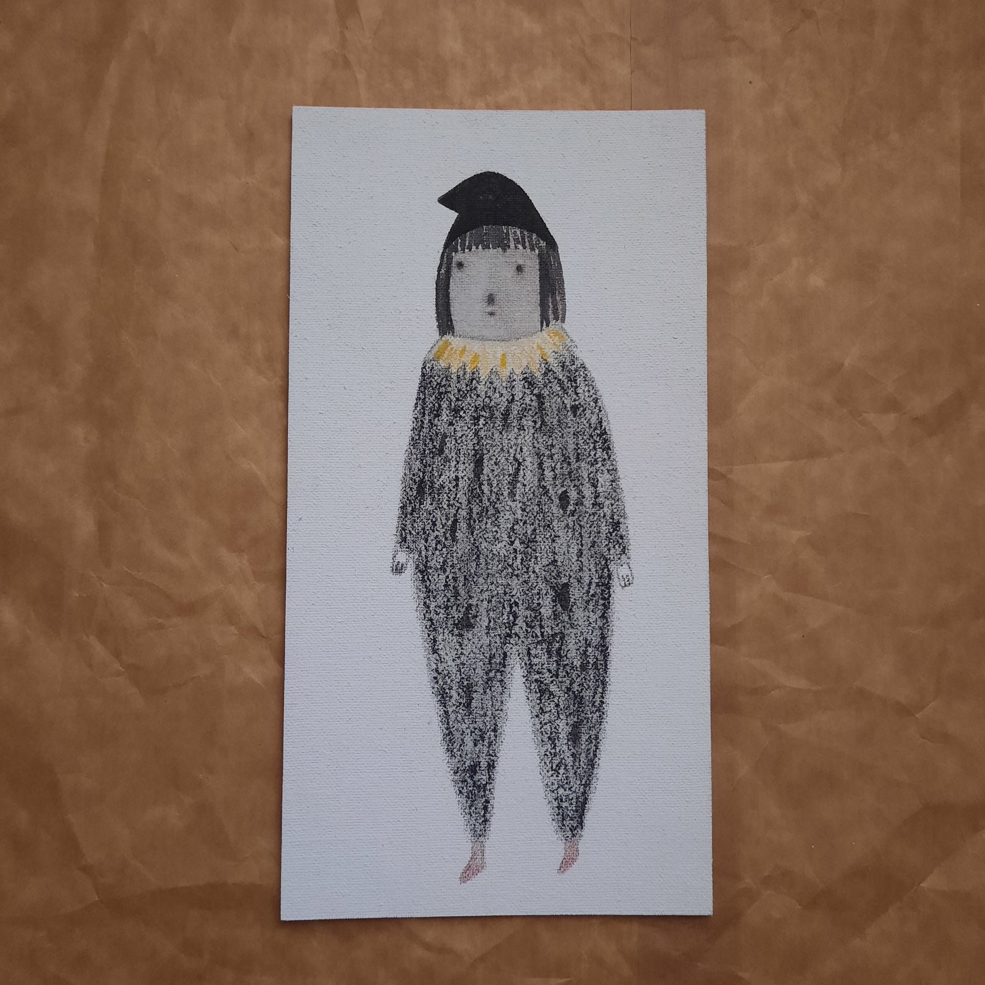Charcoal and pastels drawn on shirt collar fabric (glued) on board.