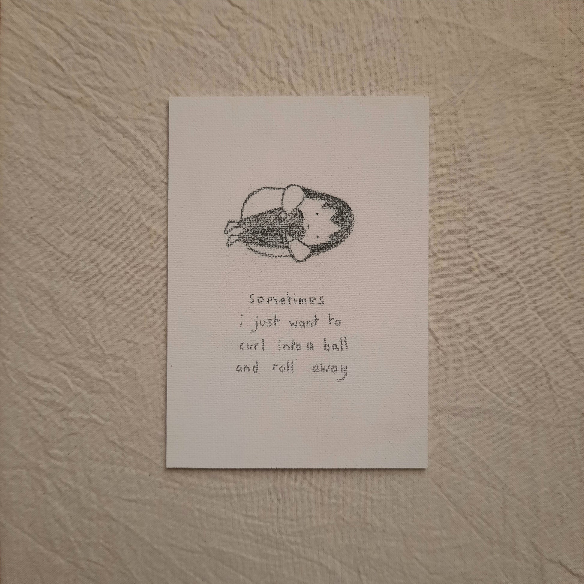Crayon and charcoal drawn on shirt collar fabric (glued) on board.