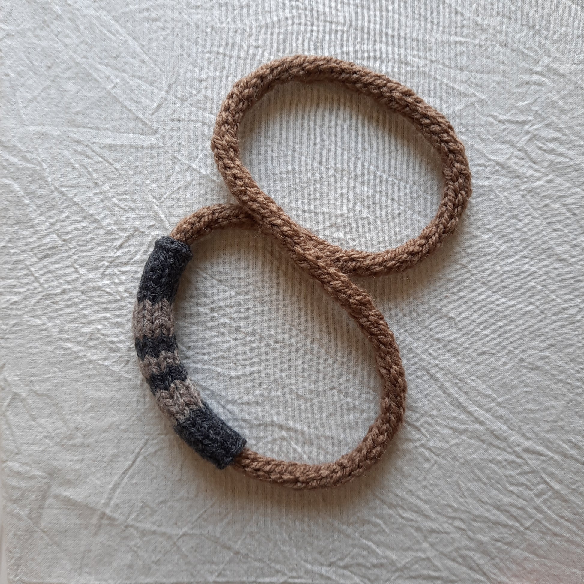 All knitted in warm caramel. The stripe is a mix of charcoal and light grey which is visibly hand sewn on the back.
