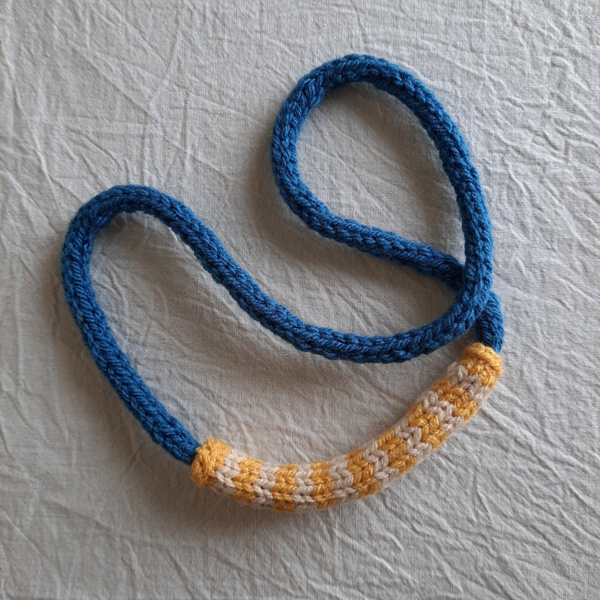 All knitted in warm blue. The stripe is a mix of yellow and cream.