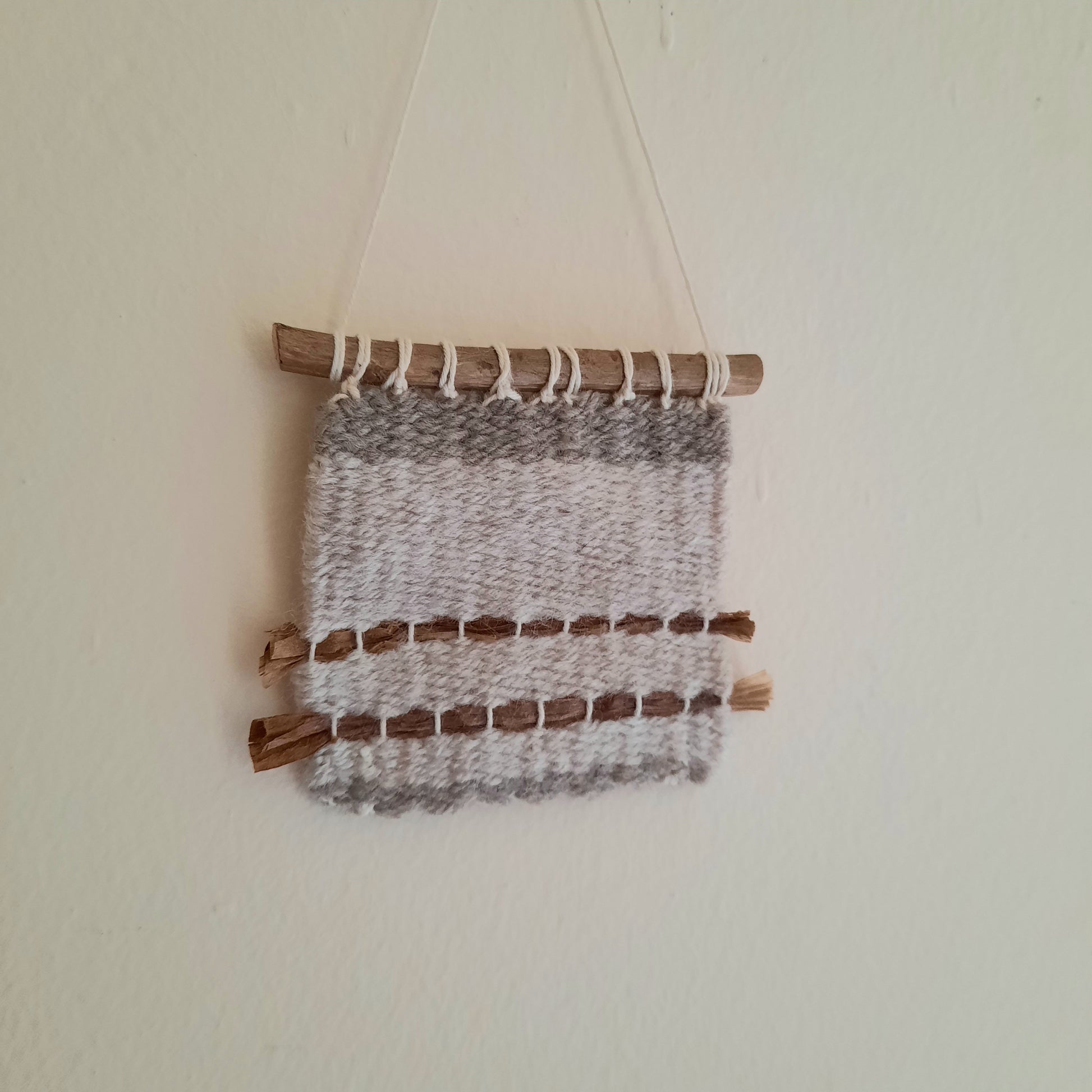 Hand woven with various wool scraps and other finds. Measuring approx 6 x 6.5 cm.